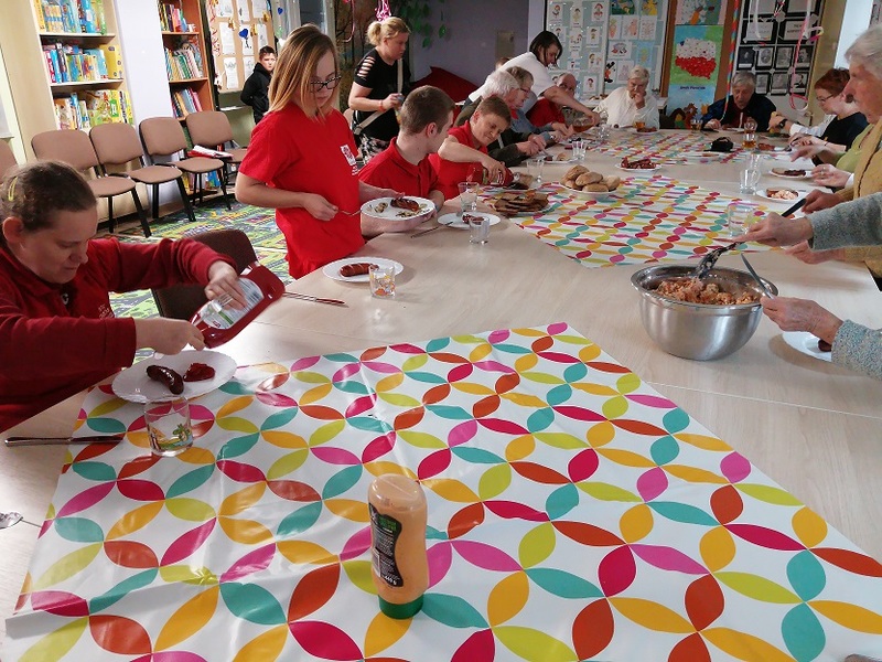 Do świętujących dołączyli także podopieczni Warsztatów Terapii Zajęciowej Caritas w Sycewicach. Niepełnosprawni przybyli w gościnę z pełnymi rękoma. Przywieźli seniorom specjalność swojej placówki – ręcznie wykonane anioły i inne upominki wykonane przez uczestników pracowni stolarskiej i plastycznej. Także goście z Sycewic zaprezentowali się przed gospodarzami tanecznie i muzycznie.