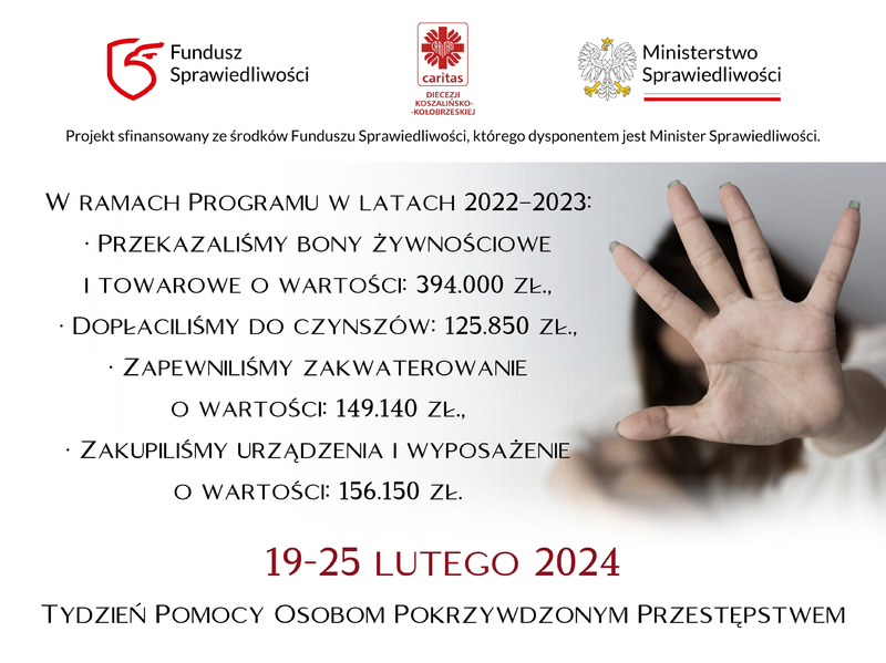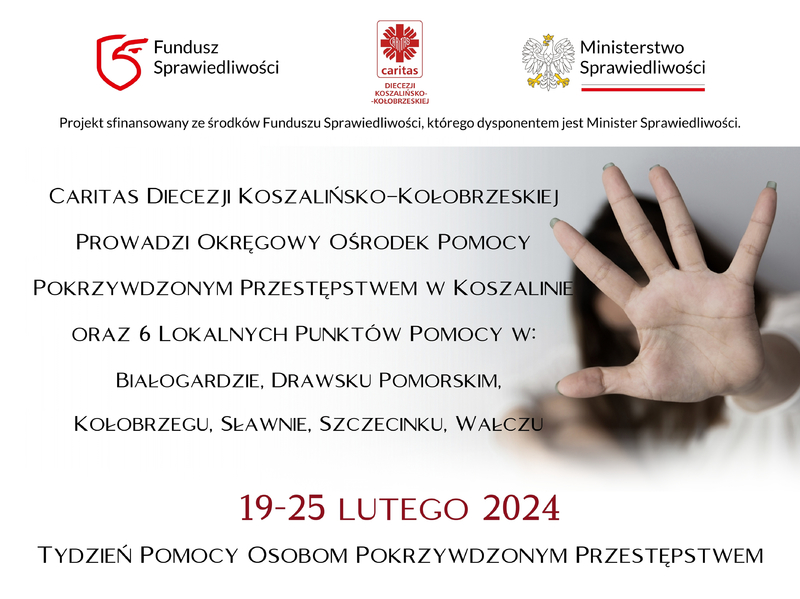 W dniach 19 - 25. lutego obchodzimy Tydzień Pomocy Osobom Pokrzywdzonym Przestępstwem. Obchody wiążą się z przypadającym na 22. lutego Międzynarodowym Dniem Ofiar Przestępstw. W tym czasie, zwracamy szczególną uwagę na potrzeby i prawa ofiar przestępstw. Caritas pomaga osobom pokrzywdzonym poprzez: